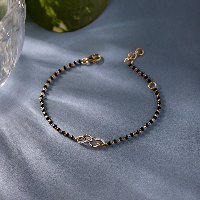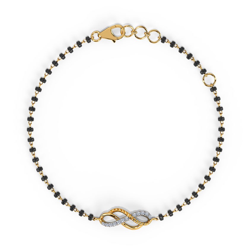 The Arden Infinity Diamond Mangalsutra Bracelet in 14 KT Yellow Gold is a modern reinterpretation of traditional values. Adorned with diamonds, this bracelet features the infinity symbol, representing eternal love and connection. Its sleek design makes it suitable for everyday wear, offering a blend of cultural significance and contemporary elegance. Perfect for the modern woman who cherishes tradition in a subtle, stylish manner.