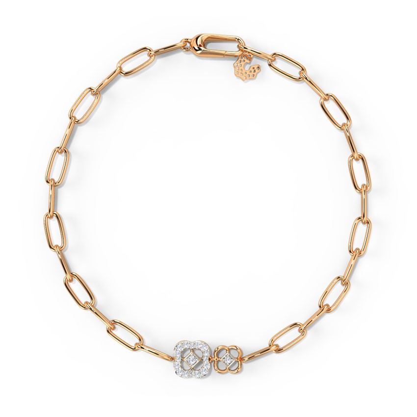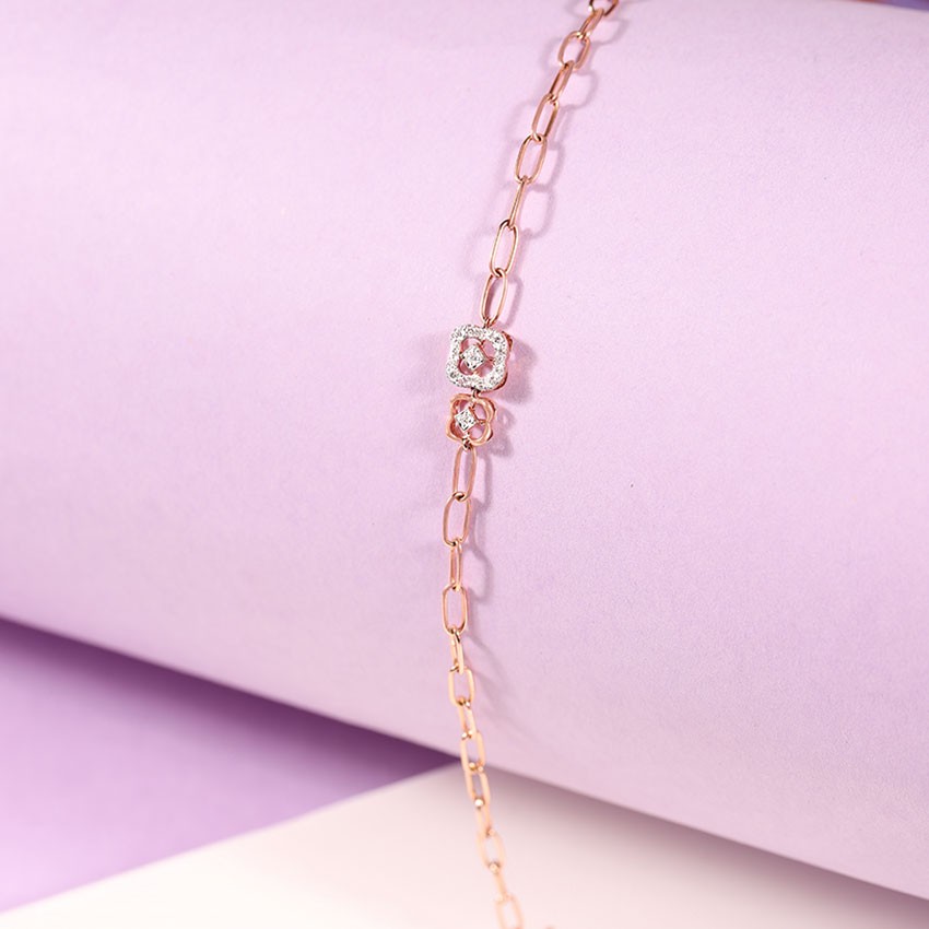 The Twin Clover Diamond Bracelet, crafted in Rose Gold, is a symbol of luck and luxury. Its design features clover motifs, each adorned with diamonds, representing the four leaves of luck. This bracelet blends the charm of folklore with the sophistication of modern jewellery design, making it a perfect accessory for those who wish to carry a token of luck and elegance. Whether worn alone or stacked with other bracelets, it adds a refined and auspicious touch to any outfit.